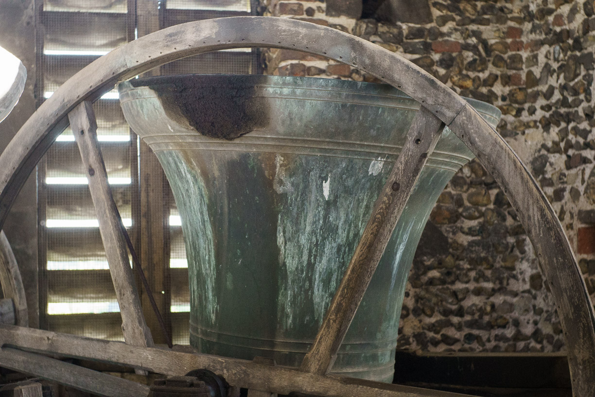In the 15th century oak bell frame was erected in the top of Laxfield Tower, originally for five bells then later extended for six. This is the frame that is currently in use and is a beautiful structure, but is no longer sufficiently robust to withstand the forces of six bells being rung for any extended period of time. The tower moves when the bells are rung!
